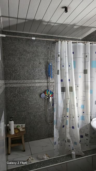 - Санузел с душевой зоной: смеситель с лейкой, штанга, шторка, кафельная облицовка стен и пола.