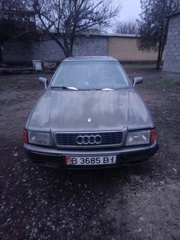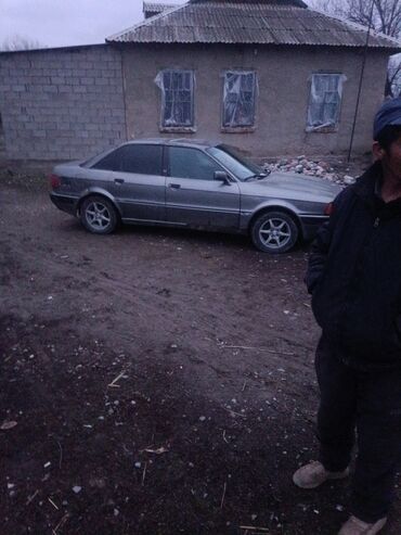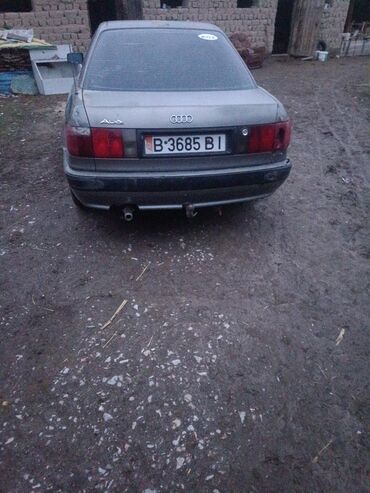 Audi 80 седан, серый цвет, тонированные стекла. Номерной знак KG, задняя часть с фирменными эмблемами Audi.