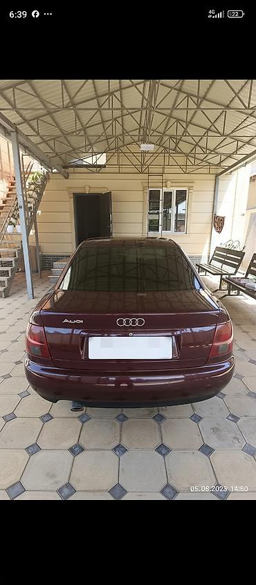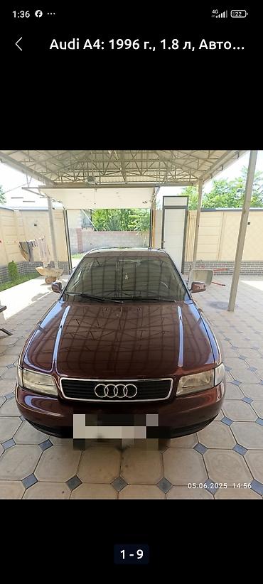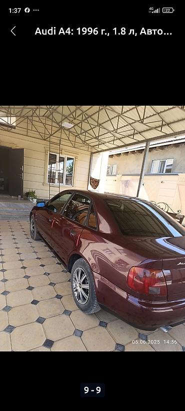Audi A4, седан, выпуск 1996 года. Бензиновый двигатель 1.8 л. Автоматическая коробка передач. Привод передний. Кузов окрашен в бордовый цвет, тонированные стекла. Легкосплавные диски, шины универсального типа. Хромированная окантовка решетки радиатора, оригинальные эмблемы Audi. Один выхлопной патрубок.