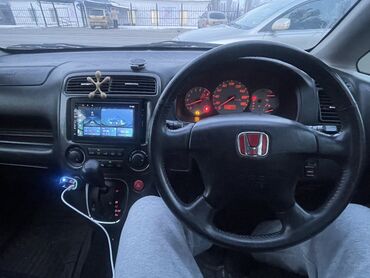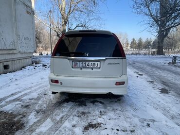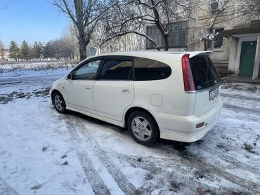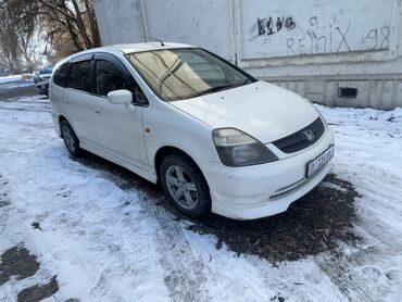 Honda Stream, белый цвет, правый руль. Кузов компакт-вэна с удлинённой крышей и большим остеклением, тонировка задних стекол. Аэродинамический обвес по кругу, спойлер на крыше. Передняя оптика с затемнёнными масками, противотуманные секции в бампере. Легкосплавные диски, зимние шины. Боковые зеркала и ручки дверей в цвет кузова. Пятидверная компоновка, удобная посадка/высадка, большой багажный отсек.
