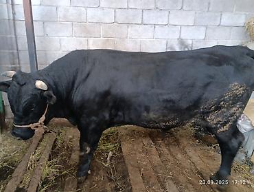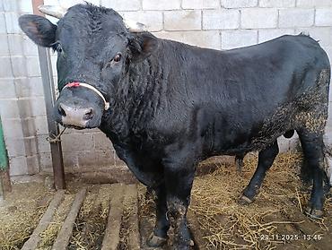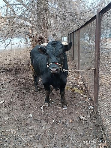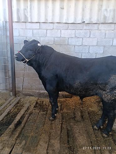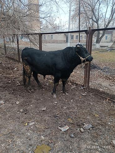 Бык мясного направления, черной масти. Крупный, мускулистый корпус, широкая грудь и развитая задняя часть. Плотная короткая шерсть, ровная линия спины. Уши с желтыми бирками. Содержится в загоне, ж...