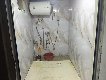- Отдельная душевая: накопительный электрический водонагреватель, душевой гарнитур с лейкой, смеситель, слив в полу, облицовка плиткой.