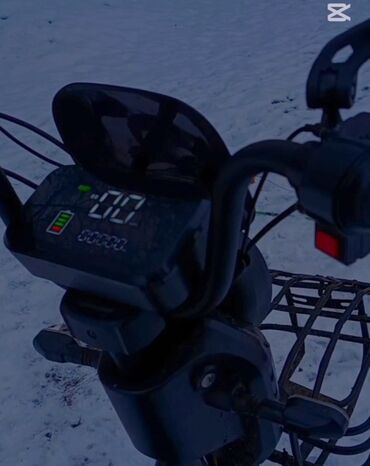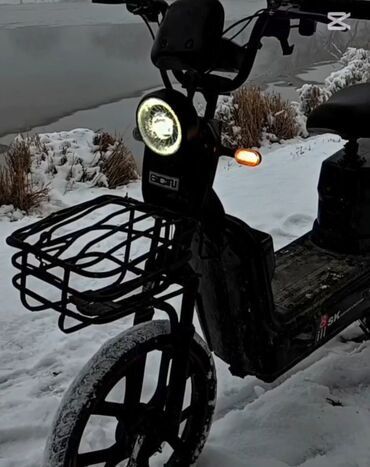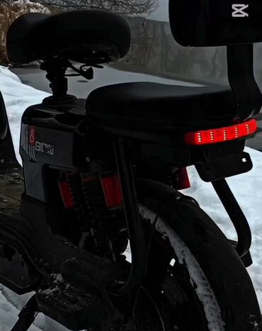 Электрический самокат черного цвета с широкими колесами, сиденьем и двойными задними амортизаторами. Модель оснащена фарой, зеркалами заднего вида и дисковыми тормозами, обеспечивающими безопасност...