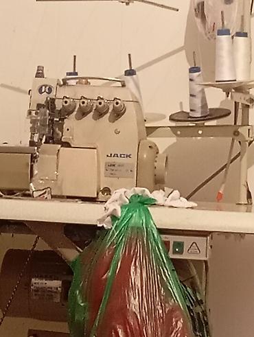 - Промышленный оверлок JACK (многоигольный/многониточный). Узел петлителей и ножевой блок для обрезки кромки, раскладка под 4–5 нитей, катушечная стойка на несколько конусов. Предназначен для обметки срезов, стачивания и обработки трикотажа и тонких/средних материалов. На столе — блок управления с кнопкой питания и индикацией.