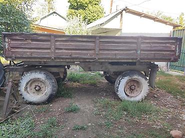 - Прицеп двухосный самосвального типа: металлический кузов, рессорная подвеска, колёса на жёсткой оси. Подходит для перевозки сыпучих и штучных грузов в хозяйстве.