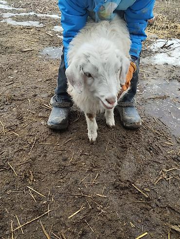 - Пуховые козлята белого окраса: компактные, с мягким длинным пухом, опущенные уши, прямая спина, крепкие ноги. Подойдут для дальнейшего разведения и получения пуха/шерсти.