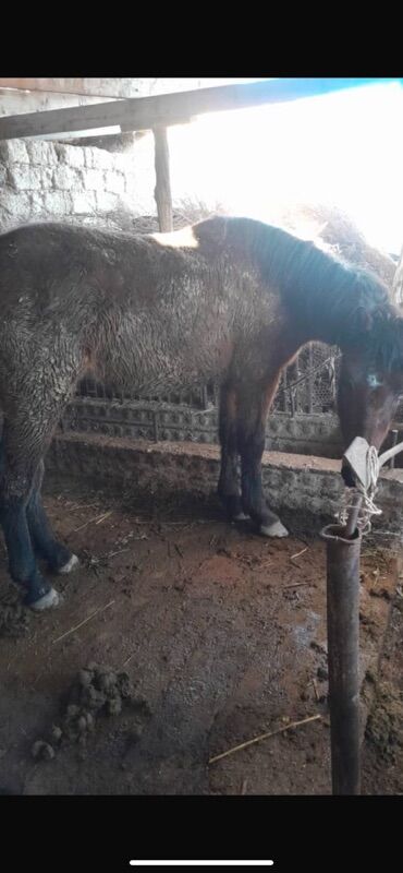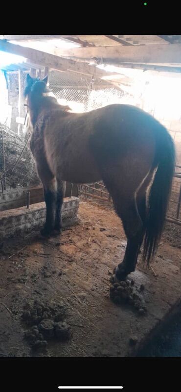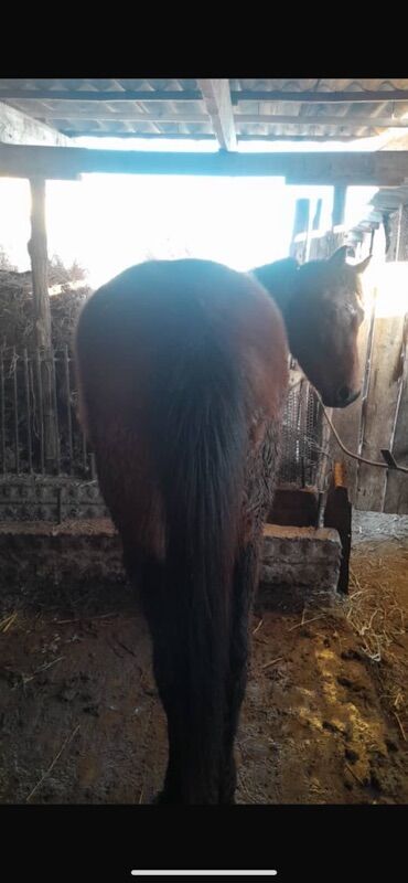Лошадь, масть гнедо-караковая, с темными ногами и длинной густой гривой и хвостом. Корпус крепкий, широкий круп, ровная спина, правильная постановка конечностей. На фото — в стойле, привязь через недоуздок/верёвку. Подойдёт для хозяйственных работ, верховой езды и дальнейшей выездки.