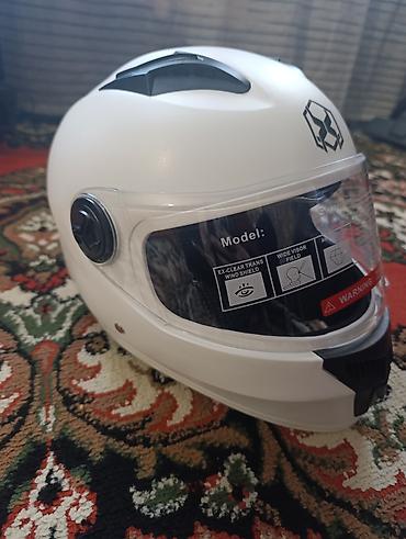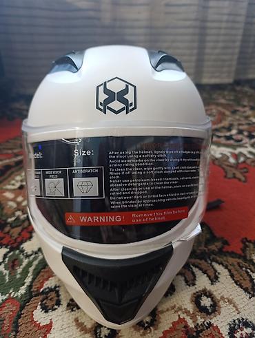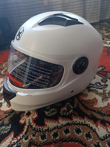 Подходит для езды на мотоцикле, скутере, мопеде. Современный дизайн, фирменный логотип на боках и спереди. Цвет — белый матовый с чёрными элементами. Шлем новый просто не подошёл по размеру