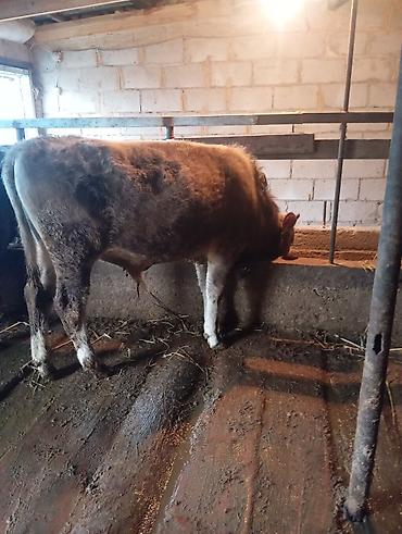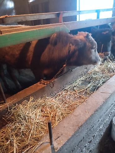 Молодой бычок коричневого окраса, рогатый. Содержится в отдельном стойле, на привязи. Кормление – сено (на фото у кормушки). Плотное телосложение, длинный туловище, крепкие ноги. Шерсть густая, с т...