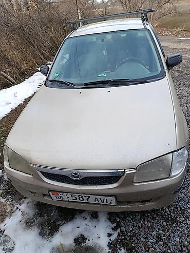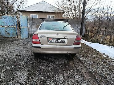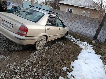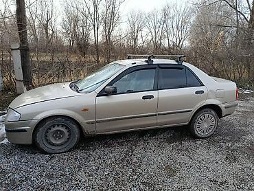 Mazda 323 седан, бежевый цвет. Кыргызские номера KG 08. Кузов 4‑дверный, зеркала и молдинги в цвете, задний спойлер отсутствует. На крыше установлен поперечный багажник/рейлинги для перевозки груза. Тонированные задние стекла.