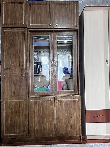 - Секция-стенка: верхние навесные шкафчики с распашными дверцами; центральная витрина с двумя стеклянными дверцами; нижний ярус — закрытые тумбы. Подходит для хранения посуды, книг, текстиля, документов и пр.