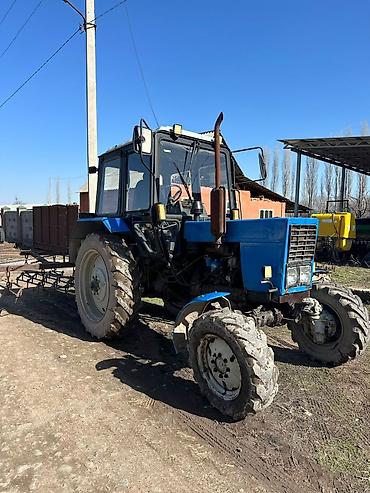 Трактор колесный МТЗ «Беларус» с кабиной, передним ведущим мостом и навесным орудием.