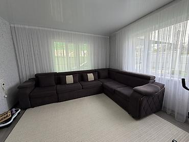 Угловой диван б/у с широкой посадкой. - Форма: Г-образный, левый угол. - Посадочных мест: 6–7. - Обивка: комбинированная — светлая ткань на сидениях и спинках, темно-коричневая ткань на боковинах ...