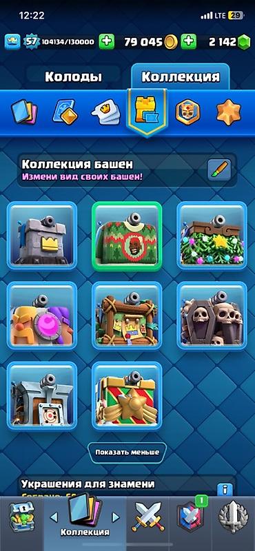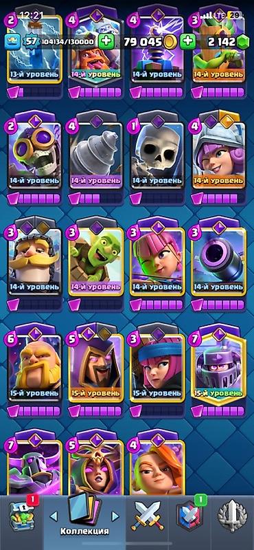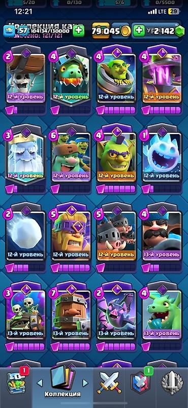 Отличный аккаунт для комфортной игры на высоких лигах: есть все карты, много топовых на 14–15 уровнях, приличный запас золота и гемов, расширенная коллекция скинов башен.