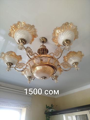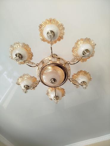 - Конструкция: 6 боковых плафонов + центральный закрытый плафон; крепление к потолку через декоративную чашу.