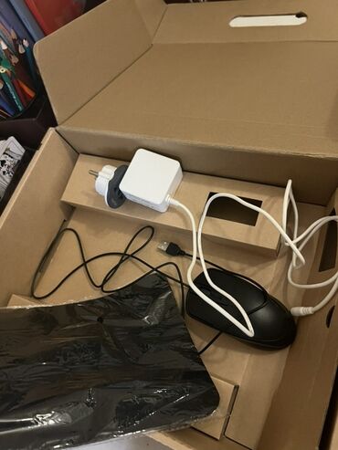 - Комплектация на фото: сетевой адаптер питания, проводная USB‑мышь, коврик для мыши, коробка.