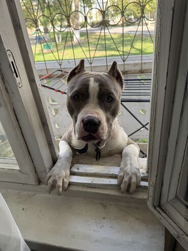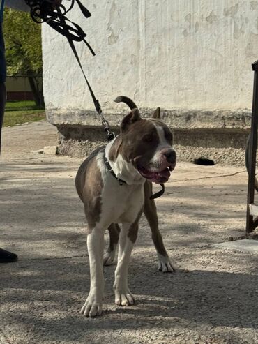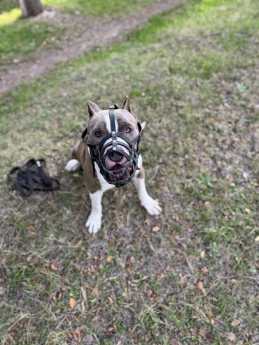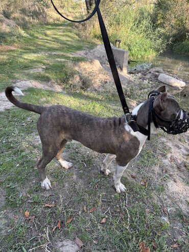 Американский питбультерьер (кобель) — атлетичный, мощный, с выразительной головой и короткой шерстью тигрово-серого окраса с белыми отметинами. Купированные уши. На фото — собака в наморднике и на прочном поводке.