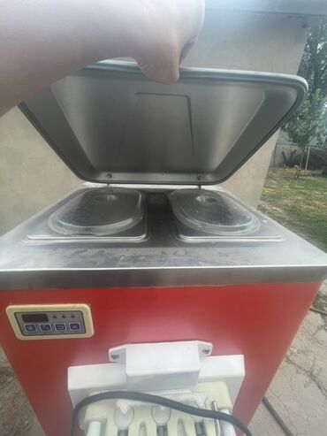 Аппарат для приготовления мягкого мороженого, выполненный в красном и серебристом цветах. Оснащен тремя рычагами для выдачи продукта, что позволяет готовить два разных вкуса и один смешанный. На лицевой стороне аппарата имеется графическое изображение мороженого в рожках и надпись "ICE CREAM", а также надпись "МОРОЖЕНОЕ" на русском языке. Мобильность аппарата обеспечивают колесики, что удобно для перемещения. Верхняя часть аппарата включает две крышки для загрузки ингредиентов. Устройство подходит для использования в кафе, точках общественного питания или на мероприятиях. Реальному клиенту уступлю