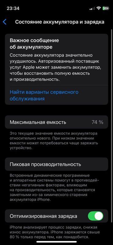 - На скриншоте из настроек: «Состояние аккумулятора и зарядка» — максимальная ёмкость 74%, отображается уведомление о необходимости обслуживания батареи. Включена «Оптимизированная зарядка».