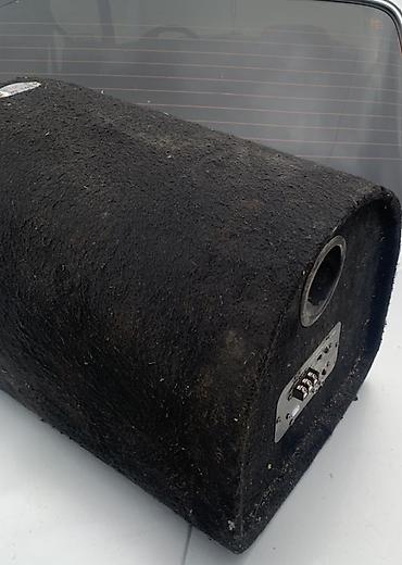 - Корпус: обтянут акустическим карпетом, цилиндрическая форма для установки в багажнике; на торце — круглый порт фазоинвертора.
