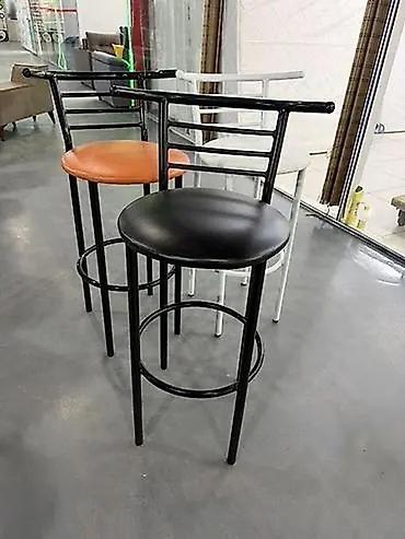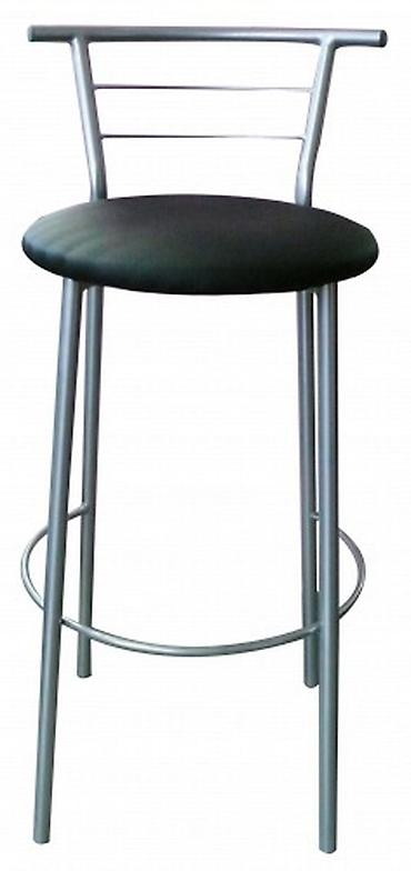 - Конструкция: металлический каркас, сварная спинка с тремя горизонтальными перекладинами, круглая база с опорным кольцом для ног.