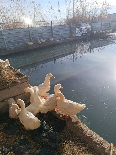 Белые утки (порода по типу пекинской/крупной белой). На фото — активное стадо на водоёме. Количество 50 штук.