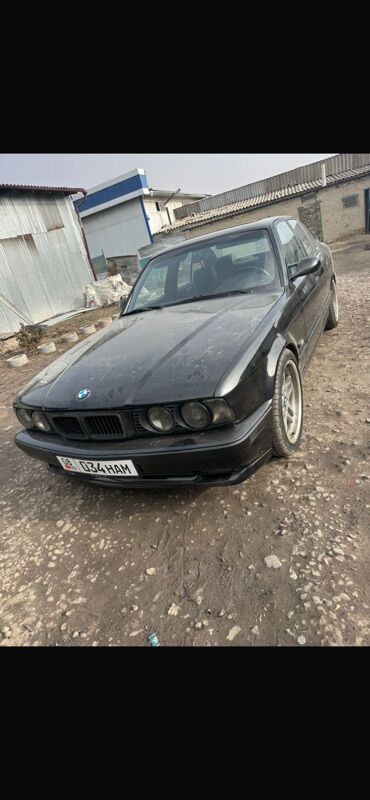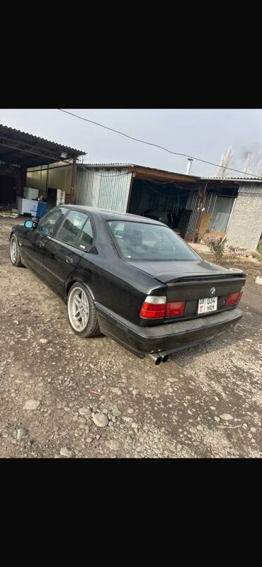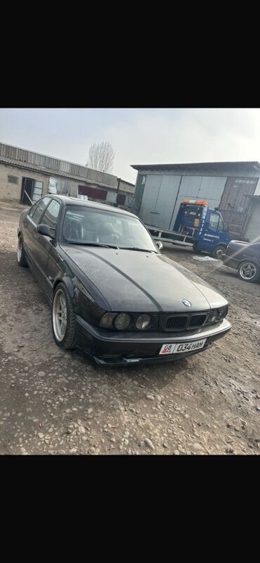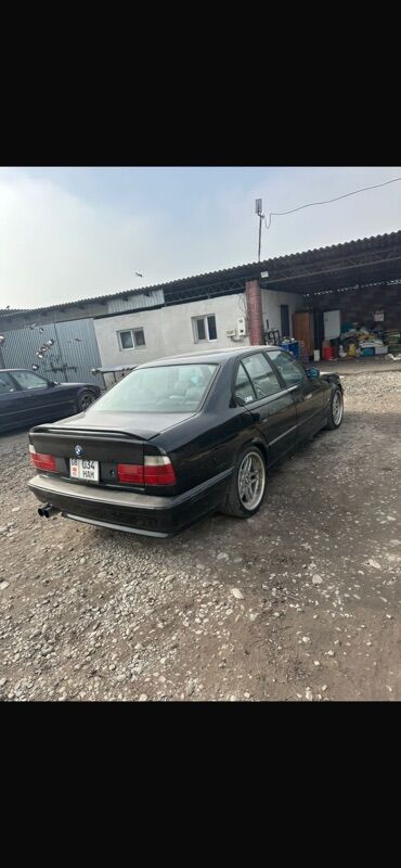 BMW 5‑серии E34, седан, черный цвет. Классический дизайн с «ангельскими» круглыми фарами и фирменной решеткой. Автомобиль на легкосплавных дисках BMW с низкопрофильной резиной, заниженной посадкой и спортивным обвесом переднего бампера. Сзади установлен спойлер на крышке багажника и двухтрубная выхлопная система. Кузов с ровными линиями, оригинальная оптика и молдинги, тонировка стекол. Интерьер просматривается в светлом/сером исполнении, салон рассчитан на 5 мест.