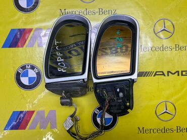 Комплект боковых зеркал заднего вида для автомобиля Mercedes Benz w211, выполненных в сером цвете. Зеркала имеют прямоугольную форму с закругленными углами и оснащены электрическими проводами для подключения. Подходят для установки на транспортные средства, обеспечивая хороший обзор дороги. Универсальный дизайн позволяет использовать их для различных марок и моделей автомобилей, включая Mercedes-Benz и BMW, судя по фоновому изображению. Электрическая регулировка обеспечивает удобство использования и настройку под индивидуальные потребности водителя.