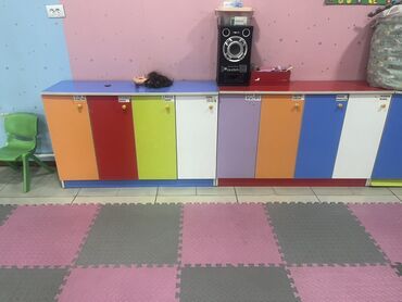 - Низкие модульные шкафчики/тумбы для личных вещей детей. Дверцы разных цветов (красный, оранжевый, зелёный, голубой, фиолетовый, белый) — помогает ориентироваться ребёнку по цвету. Каждая секция с отдельной дверцей и ручкой‑шариком, есть место для наклейки с именем. Корпус из ЛДСП, устойчивые опоры, ровная верхняя поверхность для размещения принадлежностей.
