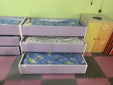 - Компактные выкатные кровати-трансформеры для тихого часа. Трёхъярусная система: каждая секция выдвигается на колёсных направляющих и убирается обратно, экономя пространство группы. Высокие бортики по периметру для безопасного сна, прочный каркас из ЛДСП, кромка по контуру. Нейтральные пастельные цвета (лаванда, красный) легко вписываются в интерьер. Подходят для матрасов детского размера; удобно маркировать именами.
