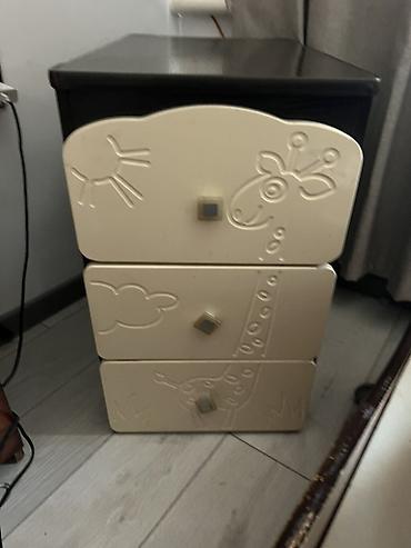 - Прикроватная тумба на 3 выдвижных ящика. Светлые фасады с рельефными детскими рисунками (жираф, облака), темная столешница. Подходит для хранения детских вещей и аксессуаров.