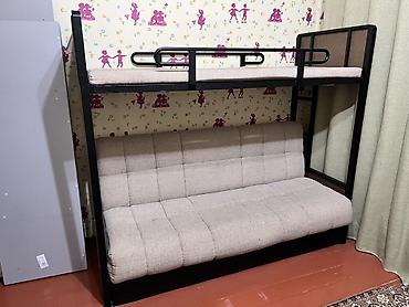 - Нижний ярус — полноценный раскладной диван-кровать. В сложенном виде — удобный трехместный диван с объемными стегаными подушками сиденья и спинки; в разложенном виде образует ровное спальное место.