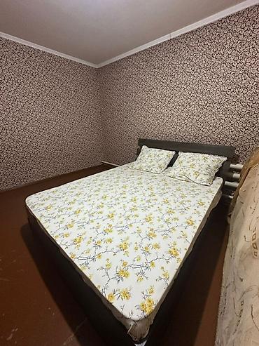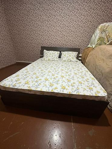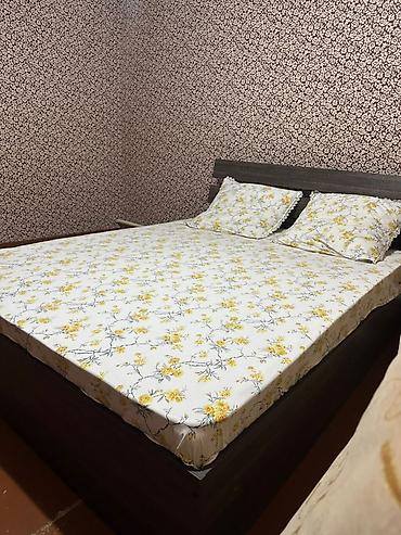 - Матрас: двуспальный, средней высоты. Сверху чехол/простыня на резинке с цветочным принтом (белый фон, желтые цветы).