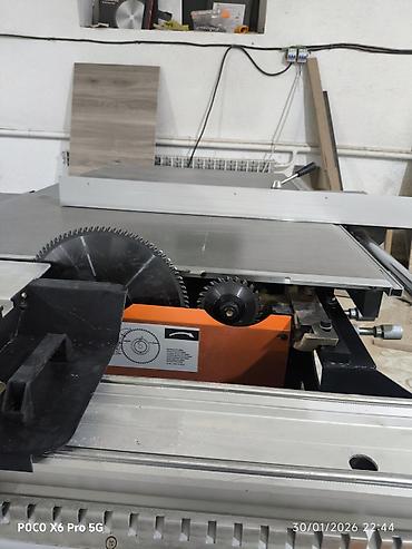 - Основной пильный узел с наклоном диска; рядом установлен подрезной диск для чистого реза ламинированных материалов без сколов.