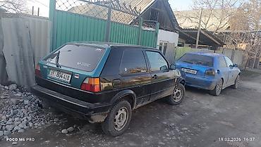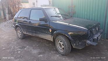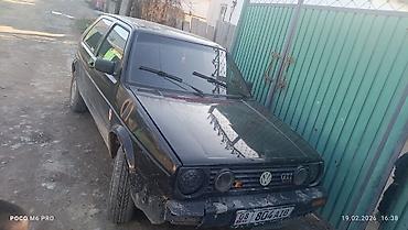 Volkswagen Golf II GTI, 3‑дверный обём 1.9 тумба дизл хэтчбек, черный цвет. Эмблемы GTI на решетке радиатора, передняя оптика с круглыми фарами и противотуманками, широкие черные бамперы, расширители арок. Лобовое стекло с двумя дворниками, тонированные боковые и заднее стекла. Легкая «ралийная» атрибутика на кузове (наклейки/шевроны). Задняя дверь с очистителем и обогревом стекла. Колеса на стальных дисках, центральные колпаки отсутствуют.