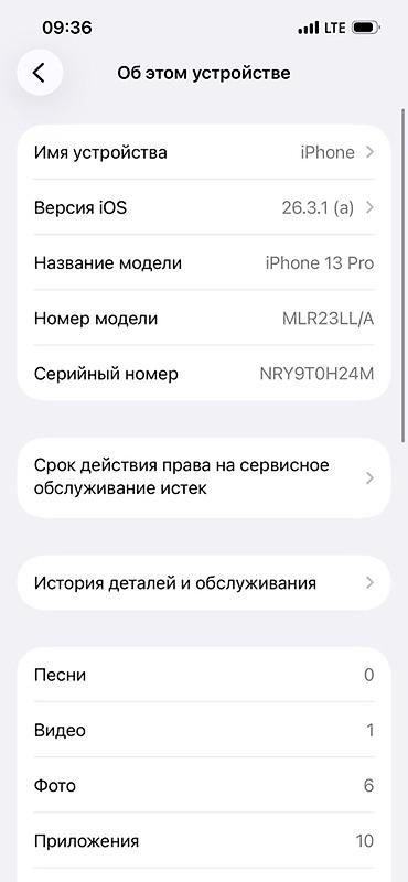 IPhone 13 Pro, 128 ГБ, графитовый цвет. Основные характеристики: - Модель: iPhone 13 Pro (номер модели MLV93KH/A) - Память: 128 ГБ (доступно около 110 ГБ) - iOS: 26.4 - Экран: 6.1", OLED Super Ret...