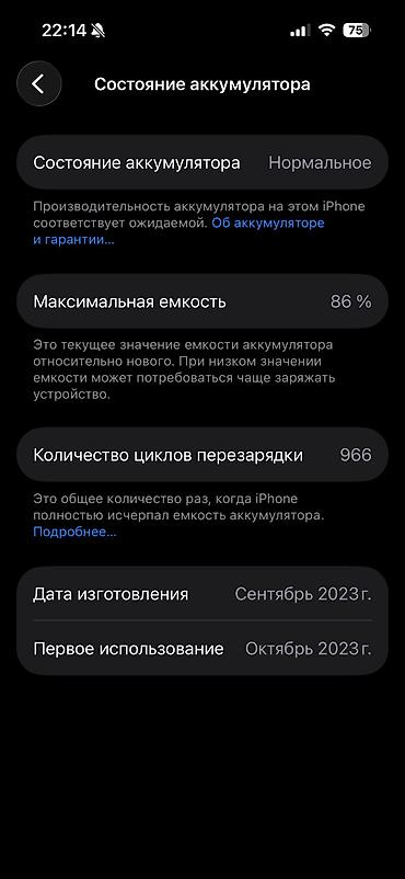 - Аккумулятор: состояние «Нормальное», максимальная емкость 86%, количество циклов перезарядки 966