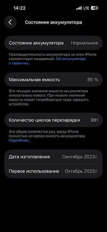 - Состояние аккумулятора: «Нормальное», максимальная емкость 85%