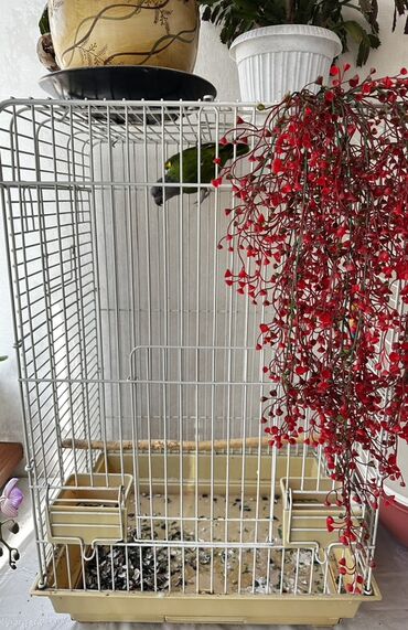 Клетка для попугая (подходит для средних пород). Просторная прямоугольная конструкция из металлических прутьев со скруглёнными углами сверху. Поддон пластиковый, выдвижной, светло-бежевого цвета, для удобной уборки. В комплекте: