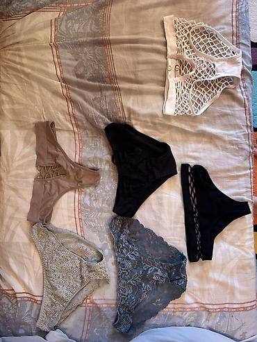 - Подборка трусиков различных фасонов: классические и бикини, с кружевом и гладкие; цвета — чёрный, бежевый, серо-голубой, с принтом. Есть модели с декоративными вырезами/переплетами по бокам и сетчатыми элементами.