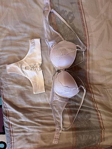 - Отдельно — бюстгальтер светлого оттенка с кружевными вставками и гладкими чашками, тонкие регулируемые бретели, удобная застёжка с несколькими уровнями фиксации.