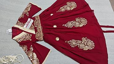 - Декор: обширная вышивка золотистыми нитями на полах, рукавах и лифе; орнаменты в традиционном стиле.