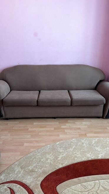 - Диван: трехместный, с тремя отдельными подушками сидений; мягкие округлые подлокотники, высокая спинка для комфортной посадки