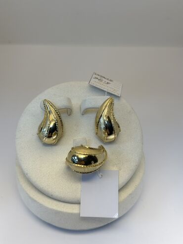 Идеально для тех, кто ищет выразительные золотистые акценты: можно носить комплектом или комбинировать по отдельности (каплевидные серьги и кольцо; либо серьги-обручи с тиснением).