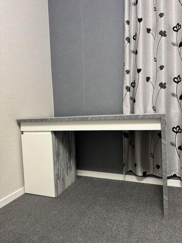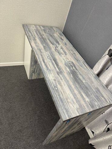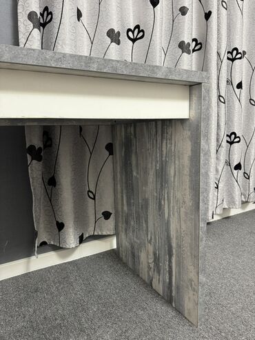 - Столешница: ЛДСП с фактурой «серый бетон/доска», кромка в цвет. Устойчива к царапинам и влаге, легко протирается.