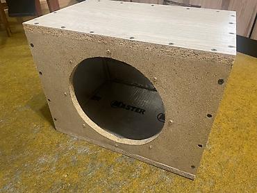 Автомобильный сабвуферный комплект. Состав: - Сабвуфер в массивном закрытом корпусе (ящик с фронтальной решёткой и декоративной графикой). - Усилитель ACV, установлен сверху корпуса. - Проводка пи...