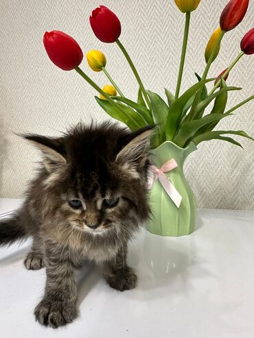 - Крупный породный котёнок мейн-кун классического тёмного тигрового (black tabby) окраса с пушистой шубкой и мощными лапами.