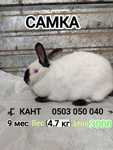 Продается кролик, самка. Возраст: 9 месяцев. Вес: 4.7-5 кг. Окрас: белый с темными отметинами (уши, нос, лапы, хвост). Город: Кант. Цена: 3000