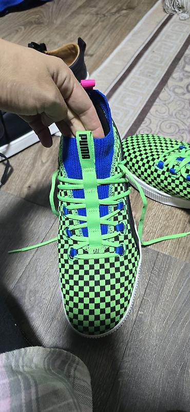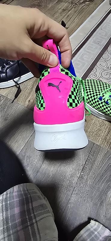 - Яркий дизайн: шахматный узор верхa в неоново‑зеленом и черном, контрастные синие вставки, салатовые шнурки, розовые петельки на пятке и розовая пятка с логотипом Puma.