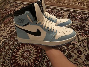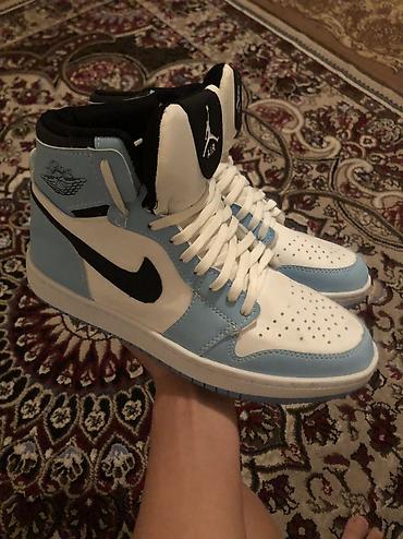 - Цвет: белый/голубой с чёрным логотипом Swoosh и крылатым логотипом на берцах